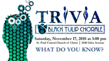 Black Tulip Chorale is St. Louis' first LGBTQIA+ all-gender, all-identity, all-orientation ensemble. We're celebrating the close of our first season with a trivia contest at 3 PM, Saturday, November 17 in the fellowship hall at St. Paul UCC, 3510 Giles Avenue (parking is available across the street). Teams (8 players) are dirt cheap - only $150! Single players are welcome too - only $20 per person! The more, the merrier!