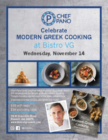 Join us for an epic night of culture, friendship, and pallet pleasing perfection as Bistro VG celebrates chef Pano and his recently debuted cookbook, Modern Greek Cooking: 100 Recipes for Meze, Entrees and Desserts!