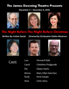 "The Night Before The Night Before Christmas" written by Cricket Daniel and directed by Christopher Kidder-Mostrom is a warm-hearted and entertaining Christmas show, new to the Chicago area. In "The Night Before The Night Before Christmas," Lou has wrestled with a big ball of tangled Christmas lights for the last time - Christmas is cancelled! Escaping New Jersey, the freezing cold, his nutty family, and most of all the holidays, is exactly what Lou plans to do. However, a freak snowstorm leaves Lou and wife Carol stranded in the airport and their dreams of sipping cocktails on the beach in peril. Will a couple of unlikely characters help restore Lou's Christmas Spirit in the St. Nick of time? Come see this show and enjoy the fun!