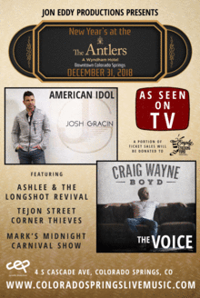 Join us for New Years Eve at the historic Antlers Hotel in downtown Colorado Springs on December 31st for an exciting night full of live music featuring Josh Gracin (American Idol, Season 2) and Craig Wayne Boyd (winner, The Voice, Season 7)!
