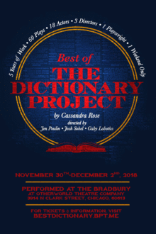 The Dictionary Project was an annual self-produced project written by Cassandra Rose for her hundreds of patrons. Friends bought plays from her, they each gave her a page number that corresponded to a page in Cassandra's dictionary, and Cassandra wrote each play within a year of being purchased. The more they gave, the longer the play, and the more creative control they had over what Cassandra wrote. Now, five years and 300 short plays later, you can come and see the top 60 plays performed by dozens of Dictionary Project alumni!