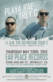 The success of their last tour I.L.A.M. The Definition Tour #1 has been evident. Touching 16 cities and 5 states in a month and a half, the reviews have been great. The momentum is strong and people are grasping the fact that these two are changing the way Independent Hip Hop can be pushed, packaged and sold. No Deals here...strictly independent with a strong connection to the everyday artist and person a like in whatever you do in your life.