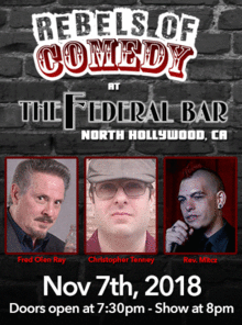 It's Rebels of Comedy at the Federal Bar in North Hollywood. Come out and see a night of live comedy, featuring an awesome lineup of professional features and headliner comedians.