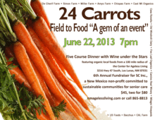 This event features local foods and wines produced within 100 miles of the Center for Ageless Living. This year's menu features "carrots" and is being prepared by the chefs at the Green House Bistro and Bakery which is part of the Center for Ageless Living. Proceeds from this event support SC, Inc. a New Mexico Nonprofit committed to sustainable communities for senior care and the Field to Food program which sends fresh, seasonal produce to home bound elders in Valencia County through Meals on Wheels