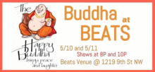 The Happy Buddha's back! With some great local comedy for Mother's Day Weekend! On May 10th and 11th, the fifth edition of the popular Happy Buddha comedy variety show comes to Beats. Beats (beatsvenue.com) is a 1400 sq. foot performance space adjoined to the Old Dominion Brewhouse in Mount Vernon Square. They;ve already got the food and the beer, and we're bringing the comedy! See improv, standup, and storytelling presented by some of the very funniest folks in the DMV...for FREE!