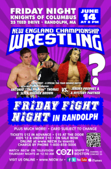 New England Championship Wrestling returns to the Knights of Columbus, 25 Teed Drive, Randolph, MA on Friday night, June 14th, 2013 for a FRIDAY FIGHT NIGHT!