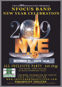 This NYE celebration will include live entertainment from the band NFocus, Hors D Oeuvres, DJ Music, party favors, Champagne toast at Midnight and a dance floor. This event will include the Dynamic voices of Motown cast members from the hit play. Visit my website www.TripleRRRproduction.com for overnight discount accommodation at the Holiday Inn located 2 blocks from the Paramount Theatre.