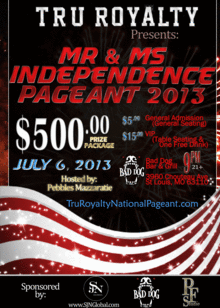 Join some of St Louis' Best Male Impersonators & Femme Queens battle it out for the title of "Mr & Ms Independence 2013!" Contestants will be judged on categories Including; *Interview *Presentation (Has to be related to Independence & Freedom) *Evening Gown / Formal Wear *On-stage Q & A *Talent (7 min max)