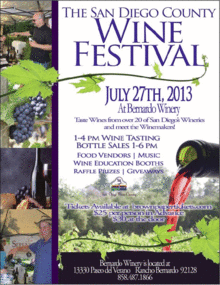 Come and taste what the growing wine region of San Diego is all about! July 27th, 2013, from 1-4pm, taste from over 2o local wineries on the beautiful grounds of Bernardo Winery, in North County San Diego. Meet the winemakers in person, talk Terrior and sip their latest vintages under the olive trees. Also, learn about the wine region and what grows so well in all of our unique microclimates! Food Vendors will be serving everything from cheese platters to crepes, to sandwiches. Music, silent auction items, giveaways from local businesses and wine education booths from the San Diego Vintner's association as well as other area vintner's associations. With each ticket purchase, guests receive 12 tastings, a personal sized fresh baguette, olive oil and vinegar for dipping and a logo tasting glass. Wine tasting from 1-4pm, Wine available by the bottle for purchase from 1-6 pm. Tickets are available online at www.brownpapertickets.com for $25 per person, $30 at the door. Local area hotels that provide shuttle service to and from Bernardo Winery include The Rancho Bernardo Inn, The Hilton Garden Inn and Courtyard Marriot, all in Rancho Bernardo. The Bernardo Winery is located at 13330 Paseo del Verano, San Diego, 92128. Phone 858.487.1866. www.bernardowinery.com For information regarding the festival and San Diego Wineries, please visit www.sandiegowineries.org