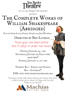 Join Ten Bucks Theatre for our Grand Opening production in our new space at the Bangor Mall! Directed by Ben Layman, this production is sure to delight audiences! The three man show will have you in stitches as they perform all 37 of the Bard's plays in two hours!