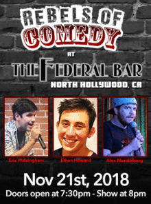 It's Rebels of Comedy at the Federal Bar in North Hollywood. Come out and see a night of live comedy, featuring an awesome lineup of professional features and headliner comedians.