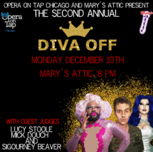 Originated by OOT Twin Cities, the Diva-Off is a competition where singers bring their A-game arias to compete for the position of reigning Opera on Tap Chicago Diva or Divo. There will be prize money, and our panel of judges for this illustrious competition will be drag queens and a king! Between singer rounds, these drag judges will each perform a number as well.