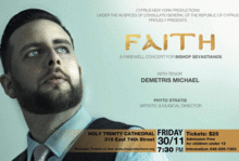 Cyprus New York Productions under the auspices of the consulate general of the republic of Cyprus in new York presents the unique concert FAITH with exceptional tenor and cantor Demetris Michael. On this spiritual journey through the centuries, Faith becomes a solid chain that links and merges Byzantine Hymns, Gregorian Chants, Operatic Arias, Gospel, musical theater and pop music. Faith is not just words on a page or in a song, it is a way of life, it is an acceptance of what we cannot see but feel deep within our hearts.