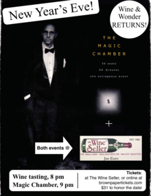 The Magic Chamber will happen only one time this entire year, New Years Eve: wine tasting from 8 to 9 pm at The Wine Seller, and immediately followed by The Magic Chamber: 30 seats, 60 minutes, one outrageous event. The one-hour show takes place in the upstairs gallery at The Wine Seller, so youll have plenty of time after to be wherever you need to be for midnight.