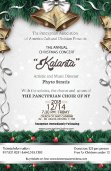 Come and Enjoy our Festive Annual Christmas Concert featured by The Pancyprian Association of America Cultural Division. Directed by the Artistic and Music Director Phytos Stratis with the soloists, chorus and actors of the Pancyprian Choir of NY. Special guest singers, the children from Saint Demetrios Elementary School and on the piano Glafkos Kontemeniotis. This concert will be held at the Church of Saint Catherine located at 22-30 33rd street, Astoria 11105 NY, on Friday December 14th at precisely 7:30 pm. Reception will take place at the end of the concert. Hope to see you all there and have a wonderful Christmas and a Happy New Year.