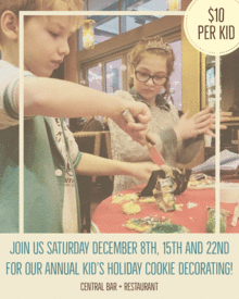 Central Bar + Restaurant would like to invite you and your kids to decorate cookies with us this Holiday Season.