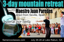 Flamenco dancers, guitarists, and singers come together for three days at Lake Rabun, GA, to learn from Maestro Juan Paredes. Classes of bulerías por fiesta focus on palmas and compás; dance elements of llamadas and marcaje and the ever important role of waiting. Singing and guitar students benefit from learning the structure of bulerías por fiesta and live experience with dancers during fiestas, which will be subtly coached.