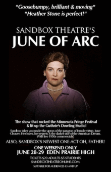 Sandbox Theatre is proud to bring their classic hit play June of Arc to Eden Prairie. After playing to sell out crowds at the 2009 Minnesota Fringe Festival, June remounted in 2010 at the Guthrie Theater's Dowling Studio, mesmerizing audiences with its wit, authenticity and heart.