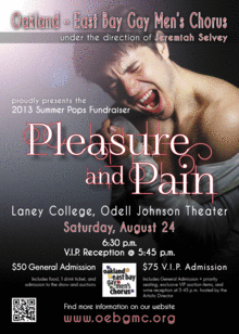 Our annual fundraiser. Come join the Oakland East Bay Gay Men's Chorus as we explore music that brings both pleasure and pain through music. Hear music featuring the full chorus, small ensembles and soloists while you enjoy wine and a light meal at the show.