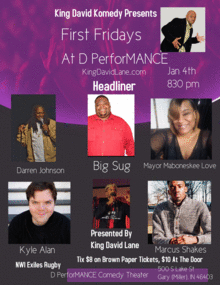 The First Friday of the month we put together a great line up of stand up comedy and/or improv. This month's show features a stacked line up of Chicago/NWI talent! Marcus Shakes, Kyle Alan, & Darren Johnson, Mayor Maboneskee Love, & a few surprises! Tickets can be bought from King David or on BrownPaperTickets.com at the link below once they go on sale. $8 in advance or $10. Doors open at 7:30! Show starts at 8:30. Music playing before & after the show.