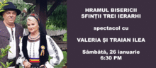 La inceput de an, vom praznui din nou, asa cum se cuvine, ziua sfintilor nostri, cei Trei Ierarhi Vasile, Grigorie si Ioan. Cu aceasta ocazie, biserica va gazdui un spectacol sustinut de invitatii speciali Valeria si Traian Ilea. Veniti sa-i ascultam, sa ne bucuram de dulcele grai romanesc, de acordurile indragite ale muzicii populare si de gustoasele bucate de acasa.