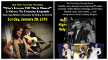 The Hills Proudly Presents- "Who's Gonna Fill Their Shoes?" A Salute To Country Legends Starring Brian Chicoine & Vicky St.Pierre $20 advance tickets include a Country BBQ buffet Dinner at 4. Show at 5:30 on the Hills stage