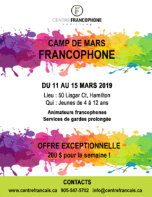 QUI : Pour tous les campeurs de 4 à 12 ans OÙ : 50 Lisgar Ct, Hamilton, ON L8T 4Y4 QUAND : du 11 au 15 mars 2019 NIVEAU DE FRANÇAIS REQUIS : il faut que l'enfant ait une bonne base de français (immersion minimum ou un des parents est francophone) pour comprendre les instructions. TARIF : 200$ par semaine 10% de réduction pour les enfants additionnels de la même famille (repas non inclus).