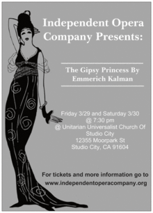 Independent Opera Company is going to present The Gipsy Princess,lovely operetta by Hungarian composer Emmerich Kalman. Full of wonderful music and entertaining dialogue, this work tells the story of Sylva, talented and beautiful Cabaret singer and her struggle to achieve respect, recognition and happiness.This is a love story with a happy end, which also talks about such serious subjects as social equality, women's rights and value of friendship and honesty, but in a very lighthearted and enchanted way. Two performances only with IOC all star cast this is the show not to be missed!