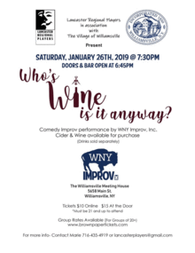 Don't miss this comedy improv performance by WNY Improv, Inc. at the Williamsville Meeting House. Wine and cider will be available for purchase. Doors open at 6:45 and the show starts at 7:30.