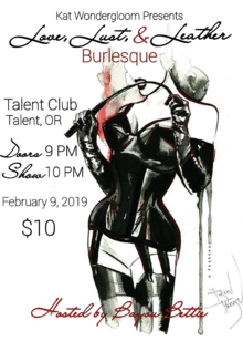 |  | EventLove, Lust, & Leather BurlesqueKat Wondergloom presents Love, Lust, & Leather. LLL is a kink/body/gender inclusive burlesque show featuring dance, music, flogging demonstrations and more!