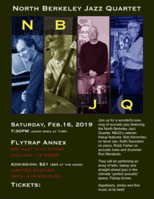 Join us for a wonderful evening of acoustic jazz featuring the North Berkeley Jazz Artet. NBJQ's veteran lineup features: Bob Kenmotsu on tenor sax, Keith Saunders on piano, Robb Fisher on acoustic bass and drummer Ron Marabuto.