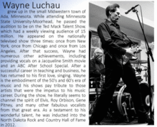 From the birth of Rock & Roll to the teen idols of the 50's & 60's performed in the authentic style from the era, Featuring Wayne Luchau. Songs by Elvis, Buddy Holly, Bobbie Vee, Carl Perkins, Ricky Nelson, Gene Pitney, Roy Orbison, Ritchie Valens, the Ventures, Gene Vincent, Jay and the Americans, Frankie Avalon, Little Richard, Jerry Lee Lewis, Chuck Berry, Eddie Cochran, Booby Darin, Buddy Knox, Don Gibson, The Platters, Everely Brothers, Pat Boone and more.