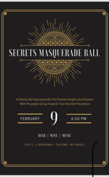 A masquerade ball being held at the Historic Pythian Temple in Tacoma. Proceeds going toward Mary Bridge Youth and Teen Suicide Prevention. They are in the early stages of a wrap around program that will be more intense than it has been in the past. Appetizers will be served, beer, wine and cocktails will be served at a no host bar.