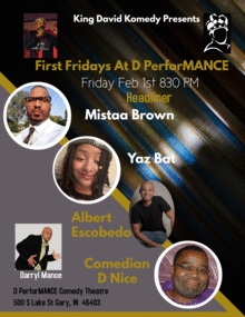The First Friday of the month we put together a great line up of stand up comedy and/or improv. This month's show features a stacked line up of Chicago/NWI talent! Yaz Bat, Derrick Dnice Smith, Mistaa Brown, Albert Mora Escobedo & a few surprises too! Tickets can be bought from King David or on BrownPaperTickets.com at the ticket link once they go on sale. $8 in advance or $10. Doors open at 7:30! Show starts at 8:30. Music playing before & after the show.