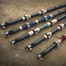 The tambin is a three-holed flute constructed from a conical vine that grows along the Niger River and in the forest region of Guinea. Its embouchure (mouthpiece) is typically constructed from a special beeswax mixture, which is heated and shaped to the flute and the players liking. Often decorated with cowry shells and other decorations, the vine is sometimes covered with leather or other skin, to strengthen the flute and protect it from cracking.