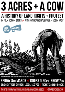 Three Acres And A Cow connects the Norman Conquest and Peasants Revolt with current issues like Brexit, fracking, the housing crisis and food sovereignty movement via the Enclosures, English Civil War, Irish Land League and Industrial Revolution, drawing a compelling narrative through the radical peoples history of England in folk song, stories and poems.