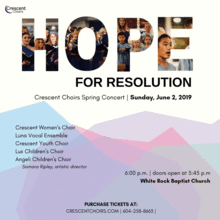Crescent Choirs will close the 2018/2019 season with Hope For Resolution. Featuring music from across a wide variety of genres, styles, and languages, the programme is tied together by themes of peace, hope, and unity. Come be uplifted by our wonderful community of singers!