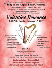 Song of the Angels Flute Orchestra under the direction of Charles Fernandez is proud to offer a beautiful afternoon of romantic music and a delicious desert buffet catered by the talented harpist (also performing) and caterer Naomi Alter.