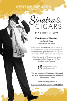 Enjoy the sounds of Sinatra in our newly renovated 4th floor theater as Mr. Tony Leodora takes the stage. Butler service hors d'oeuvres will be served in our reception area on the first floor along with a complimentary glass of congac and a special edition Mark Twain cigar in our side courtyard. This is a Montco CAC fundraiser. All proceeds will go to support the theater and children of Montgomery County, PA.