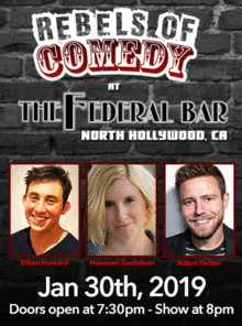It's Rebels of Comedy at the Federal Bar in North Hollywood. Come out and see a night of live comedy, featuring an awesome lineup of professional features and headliner comedians.