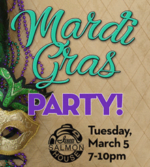 Following up on last year's sold-out Mardi Gras event, join us for "part duex" of our fabulous Fat Tuesday celebration. It's a feast for the senses at Ivar's Salmon House as we feature an exciting array of food, drinks, music and prizes. Guests are encouraged to wear a mask or dress in themed attire.