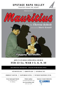 Upstage Napa Valley presents Mauritius by Theresa Rebeck, a crime caper directed by Sharie Renault in the style of film noir. Mauritius opens Friday, February 22nd at Grace Episcopal Church in St. Helena.