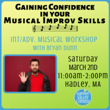 Saturday, March 2, 12:00am-3:00pm (3 hours) At The Duffy Academy of Irish Dance (right next to Happier Valley Comedy) 1 Mill Valley Rd, Hadley, MA $40 Prerequisite: Completion of Zen of Improv 3 or the equivalent long form experience from another comedy school AND classroom or stage experience with Musical Improv.
