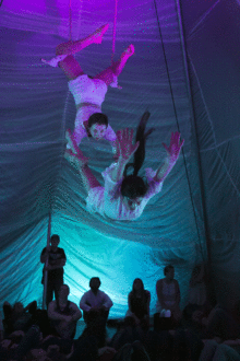 Inspired by the idea of creating community in trying times, Brave Space starts as a puddle of fabric on the floor, and grows to encompass a world of wonders that includes juggling, cyr wheel, and duo trapeze, a rope act like no other, and awe-inspiring feats of balance and strength. The audience is limited to 100 people per show, and audience members must be able to sit on the floor, stand up, walk around for the duration of the performance. Audience members requesting assistance, or a chair to sit in, should note so when purchasing tickets. In addition, Brave Space may make persons suffering from claustrophobia feel uncomfortable at times.