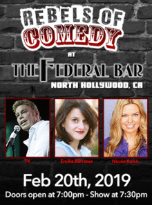 It's Rebels of Comedy at the Federal Bar in North Hollywood. Come out and see a night of live comedy, featuring an awesome lineup of professional features and headliner comedians.