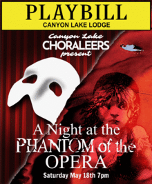 The Canyon Lake Choraleers Spring Spectacular concert will be held in the Canyon Lake Lodge Holiday Bay Room. This concert is a blend of two bigger than life shows form Broadway and the Cinema. Selections from "The Phantom of the Opera" and "Les Misérables" will be the highlight of the show. Our very talented and highly respected director Lorilee Bajema of Lorilee Productions will conduct the show. In addition to our resident pianist the Choraleers will be accompanied by special instruments, including a harp, violin and drums. As usual, a wonderful opportunity drawing will be conducted during intermission, including a big cash prize. Plan on coming to join the fun and hear some of the most memorable music from two great productions.