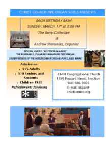 We are celebrating Bach's Birthday with a concert located at Christ Church in Brockton MA. We will have the Berry Collective and Andrew Sheranian, organist preforming. We will also have special guest "Kotzsch-in-a-Box", the buildable, playable, miniature pipe organ. Provided from friends of the Kotzschmar Organ, Portland, Maine.