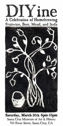 We are pleased to announce the seventh annual DIYine (pronounced D I Wine), a tasting event featuring samples of homemade fruit wines, beers, mead, and soft drinks. The event will be at the Museum of Art and History in downtown Santa Cruz (705 Front St). In addition to being a fun event, its also a fund raiser, with all proceeds going to support the Bike Church community bicycle repair shop.