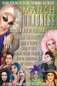 Mother Nature mad it impossible to have last month's Drag Show, but you wanted a Drag Show, SO YOU'RE GONNA GET A DRAG SHOW! Tatiana Rexia and the Seasons Performance Hall present: March Dragness!