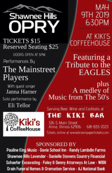The Shawnee Hills Opry is back at Kiki's with another great show. This month Janna Harner will fill in for Ashley Hatfield while Ashley takes a break to become a first time mom! Janna has been on our show as a guest and has an amazing voice. We are excited to have her with us! Opening our show with a solo performance is a local favorite who has been making quite a name for himself. Eli Tellor is back to do another show with us. This month the Mainstreet Players will do a Tribute to the EAGLES, and they have a new medley of Music from the 50's they will perform for the first time. All of our shows have been sold out so get your tickets early.
